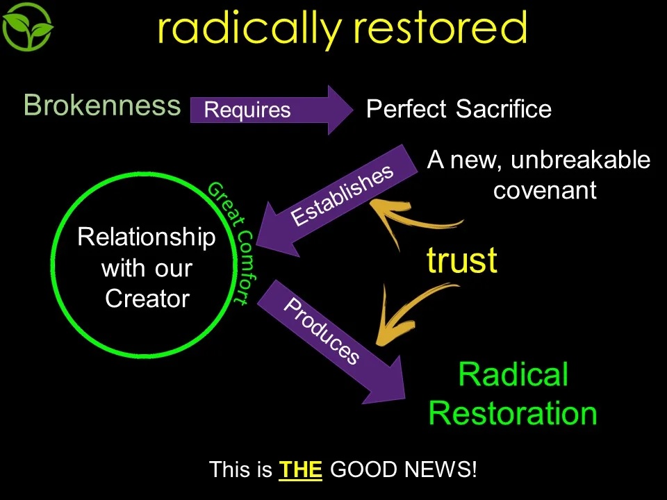 One of the slides from the sermon. The process of restoration can not happen when we try harder but comes through the free gift of intimacy with God through the work of Jesus on the cross in establishing an unbreakable covenant between the Father and the Son- and we are IN THE SON!